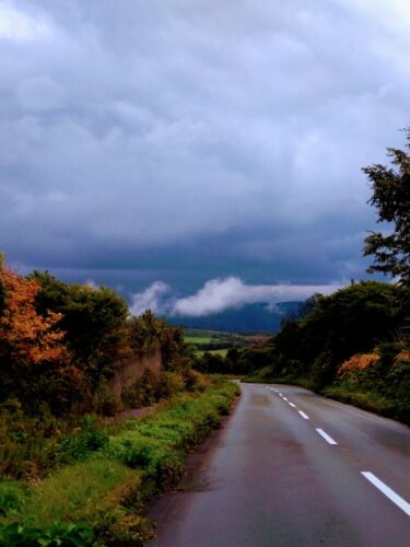 ユーモラスなドラゴンのような雲が、道路の先の右側から出て来ました。